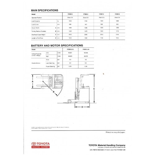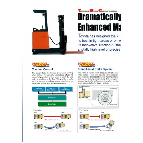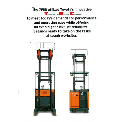 7FBR10-30 Toyota's 7-series reach truck offers the industry's first AC Power System, along with Traction & Brake Control which gives improved traction, better braking and suspension control for more stability.In addition, Power selection to provide optimum balance of power, battery use 25% longer operation at top performance level
